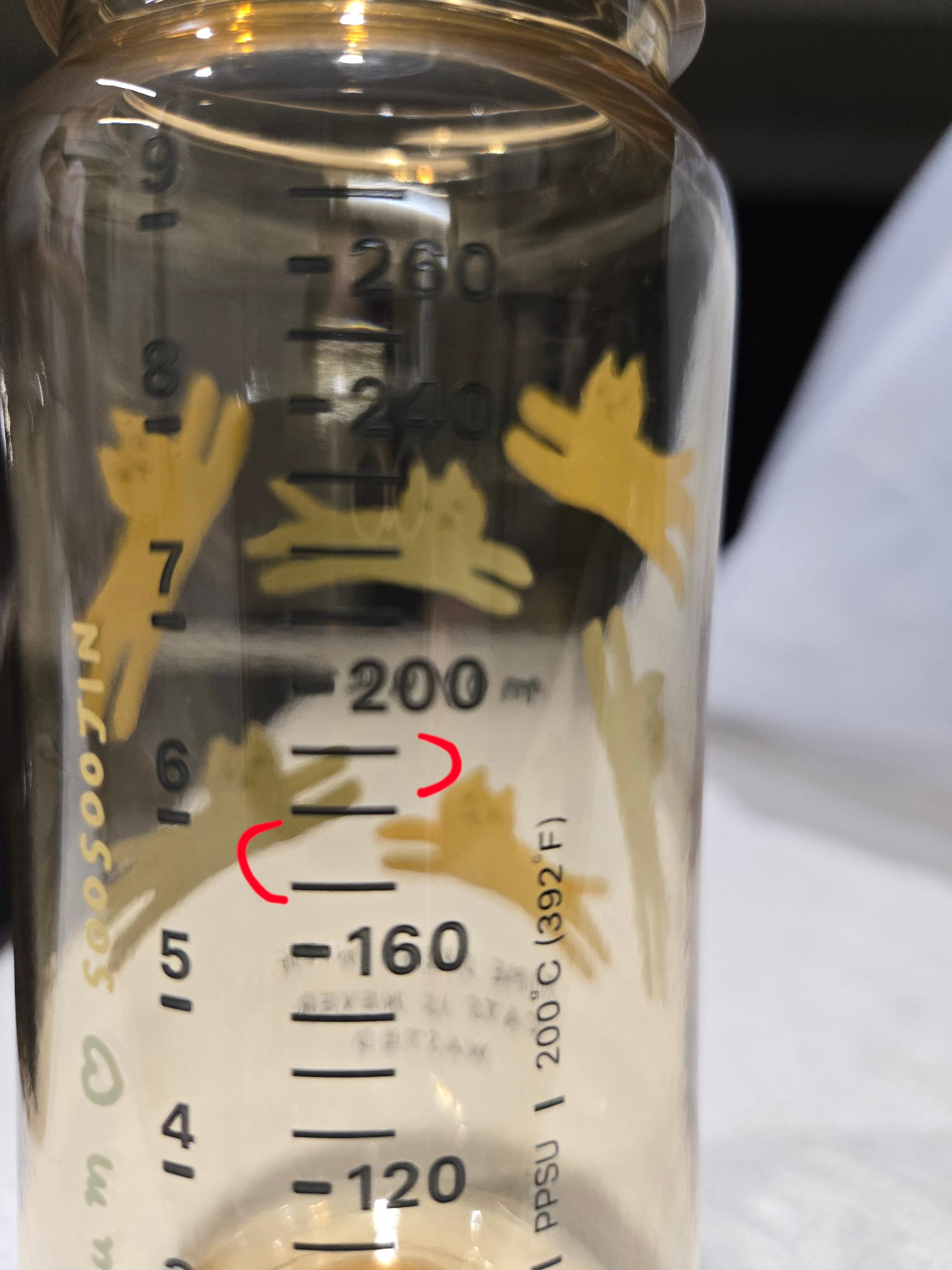 눈금도 더 선명하고 오버캡이 반투명해서 안에 꼭지가 보여서 좋아요!! (몇일전 꼭지 안끼고 뚜껑만 닫아놓은 젖병에 꼭지있는줄 알고 분유 탔다가 다 넘쳤던적이 있어서...ㅎㅎ)